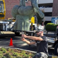 Frudakis died in 2019, before he could learn of Daedalus and Icarus’s next move—from the back courtyard to the front of the newly renovated Main Library, where it was installed on November 4, 2025, after being removed and put in storage for a time during renovations at the Main Library.