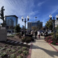 “To maintain a viable downtown area…a city must do more than build a collection of steel, concrete and brick. It must…be convenient, interesting, and most of all…attractive. The Library Plaza will be an inspiration to other concerns as they contemplate new construction in downtown Little Rock.” Heiskell proclaimed that the sculpture would be a reminder of the civic spirt of Raymond Rebsamen, who was praised as an instrumental figure in the revitalization of Little Rock’s central business district.