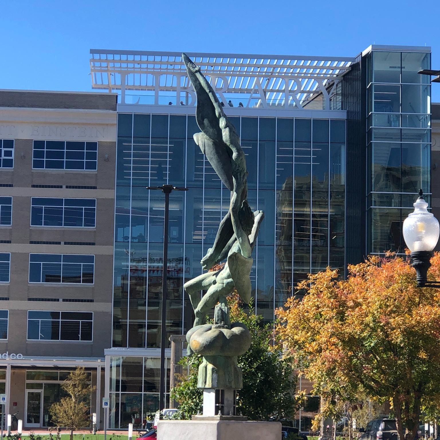 The bronze statue of Icarus and Daedalus has been part of the Central Arkansas Library System’s art collection since 1967. It was created in 1965 by Philadelphia artist Evangelos Frudakis (1921–2019) and donated to CALS in 1967 by Raymond Rebsamen, a businessman active in downtown revitalization and a leader of the Urban Progress Association. The bronze statue illustrates the Greek myth of Icarus and Daedalus warning of the dangers of excessive pride.