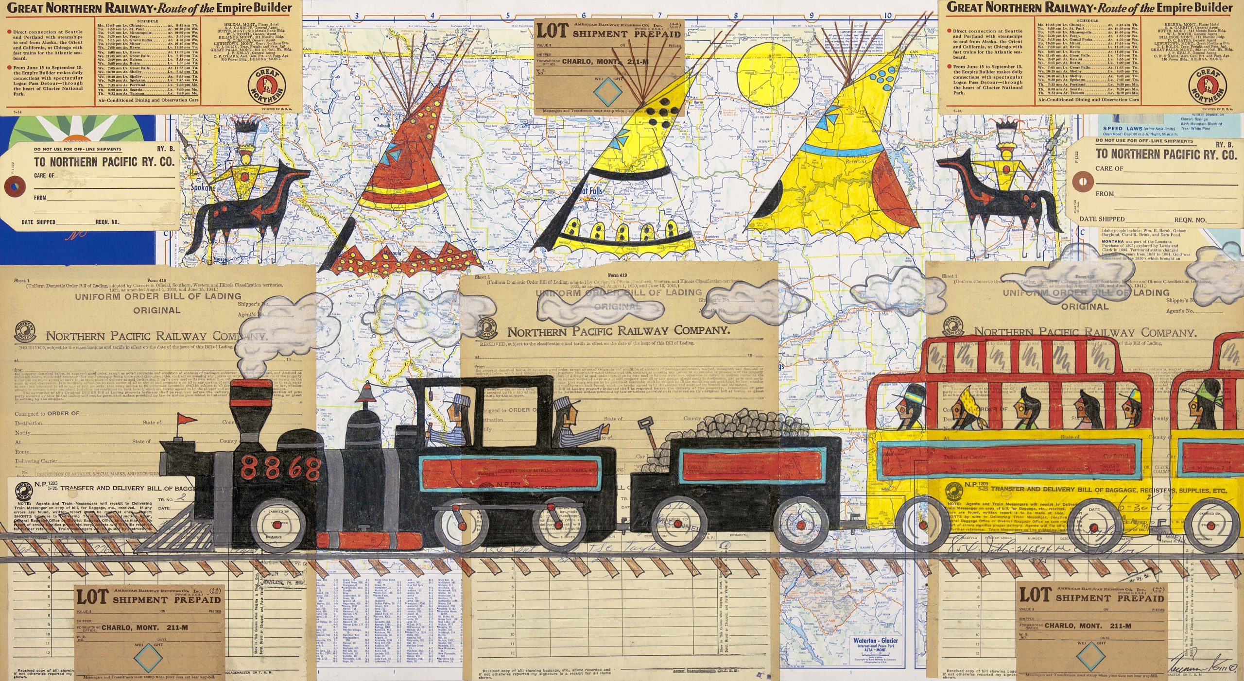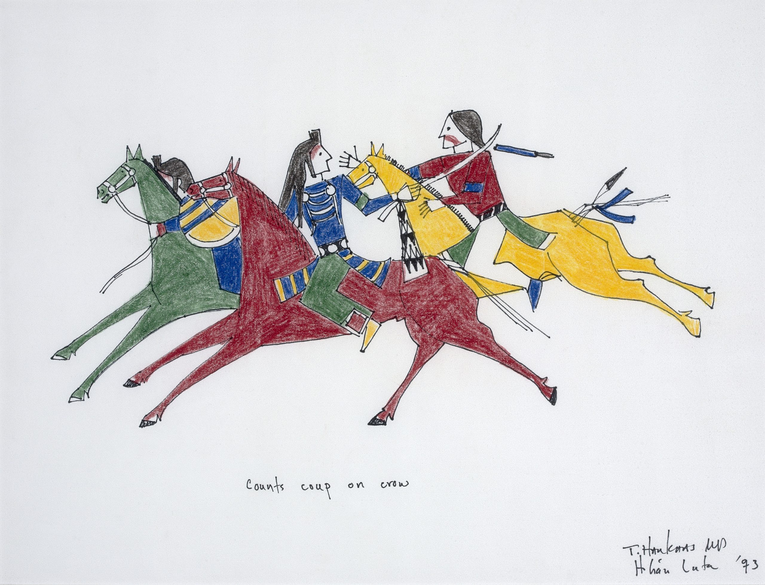 Wiggins explains that these “contemporary Ledger Art Drawings are created by Native American artists from the late 1980s until today. These drawings are done on any surface that was previously used for a different purpose. The repurposed surface, medium, and subject reflect the life of today’s Native American, just as the Traditional Ledger art did the life of that era’s Native American artists.”