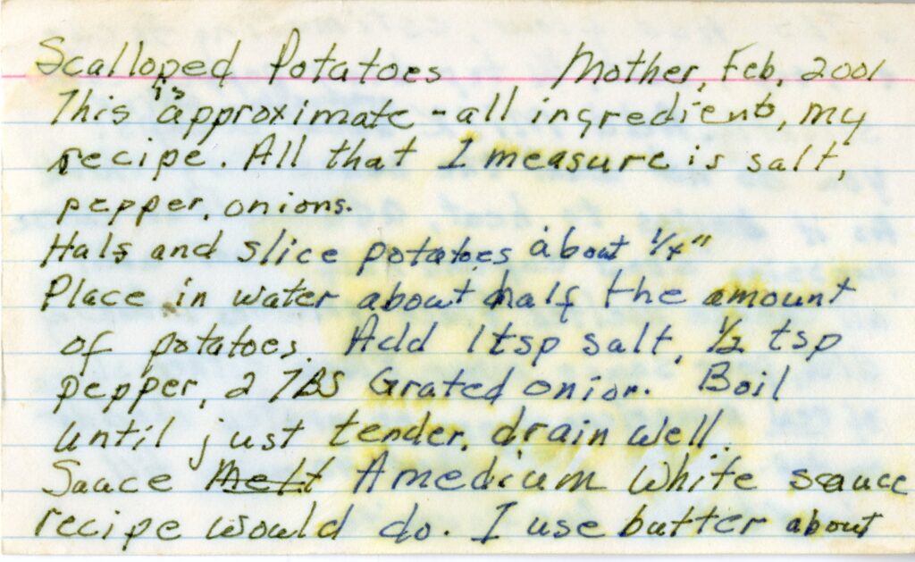 In my time assisting people with digitizing their personal collections at the CALS Memory Lab, I’ve heard countless stories of people not only losing a beloved family member but also losing a special family recipe with that family member’s passing. I managed to digitize the scalloped potatoes recipe card from my granny and send it to my family this year. I cannot imagine what I would have done had my granny passed without her scalloped potatoes recipe being saved. I could have tried a million times to wrack my brain or figure out the right proportions, but there is no way I would have ever gotten it right. It continues to be one of my strongest connections to my granny.
